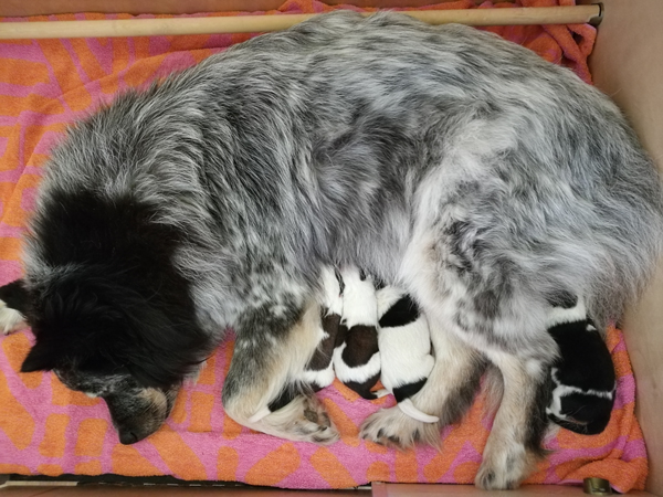 Wir sind noch gar nicht wirklich ins Bett gekommen, da hat sich Pepper ganz unruhig gemeldet, wollte am liebsten raus, sich unters Boot auf die kühle Erde zurückziehen. Wir konnten sie davon überzeugen, dass das keine so gute Idee ist. So hat unsere Süße ihre Kinder im Haus auf die Welt gebracht.